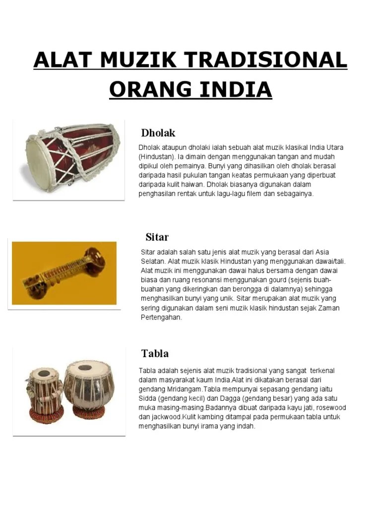 Contoh persembahan alat muzik ananda : . Dholak dholak ataupun dholaki ialah sebuah alat muzik klasikal india utara (hindustan). Dholak dimainkan untuk mengiringi muzik rakyat. Dholak dholak ataupun dholaki ialah sebuah alat .